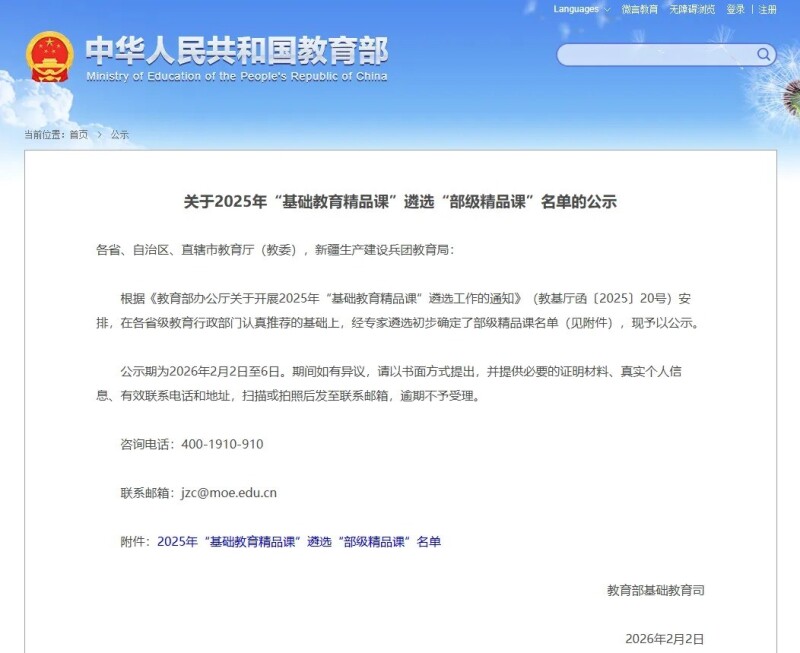 近日教育部网站公示了2025年“基础教育精品课”遴选“部级精品课”名单。