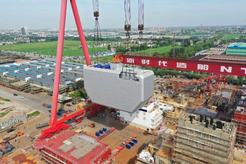这个庞大的罐体可以容纳8000立方米的液化天然气,能推动这艘排水量17.7万吨的巨轮在海上航行约1.9万海里。因为研发出“棱形LNG燃料B型储罐”技术,新时代造船据此设计出的新一代LNG双燃料集装箱船,获得全球航运业的大量订单,成了明星拳头产品。