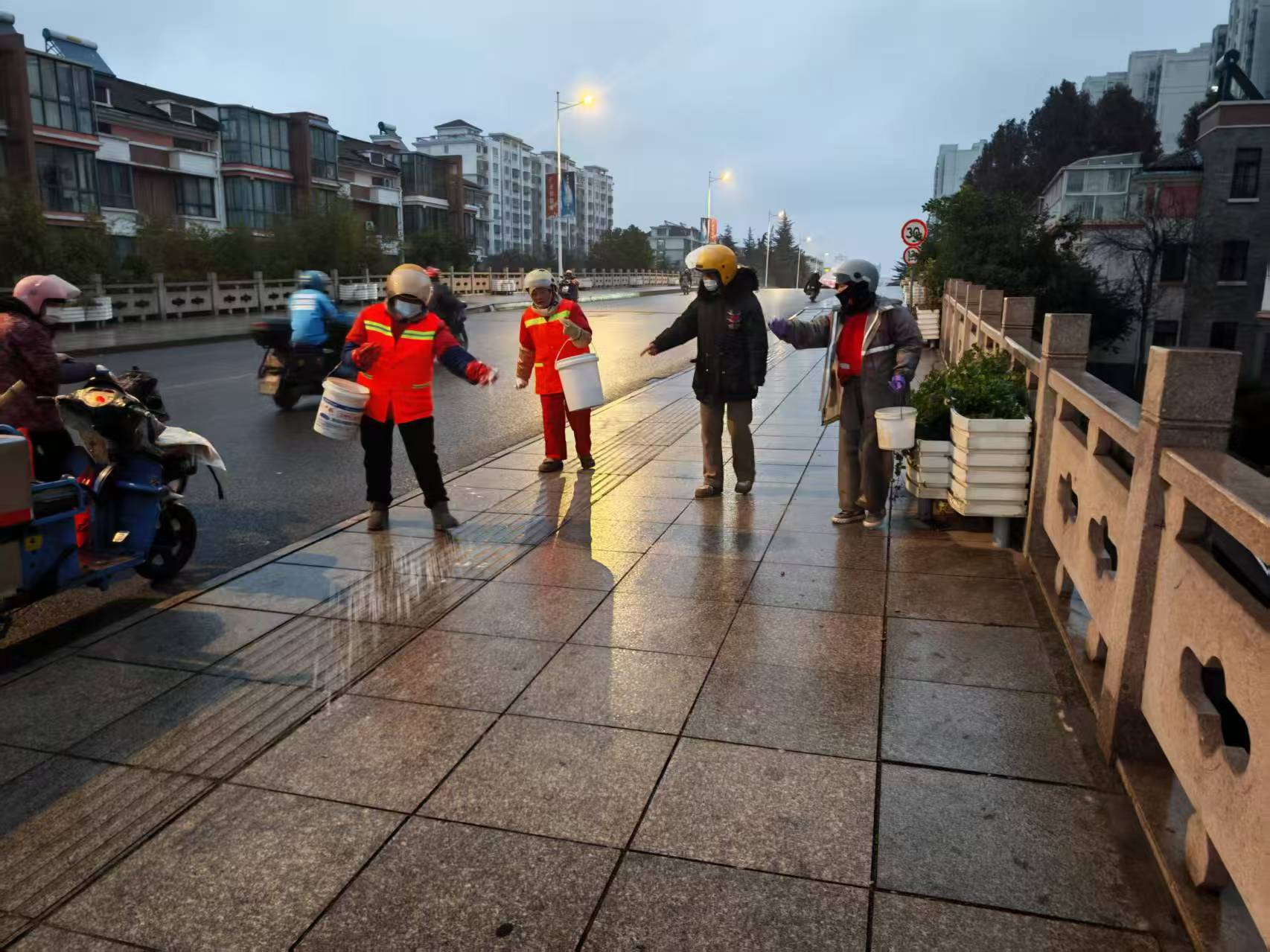 当天傍晚,环卫处针对桥梁、坡道等易结冰路段,提前开展预防性撒盐工作,防止低温结冰。