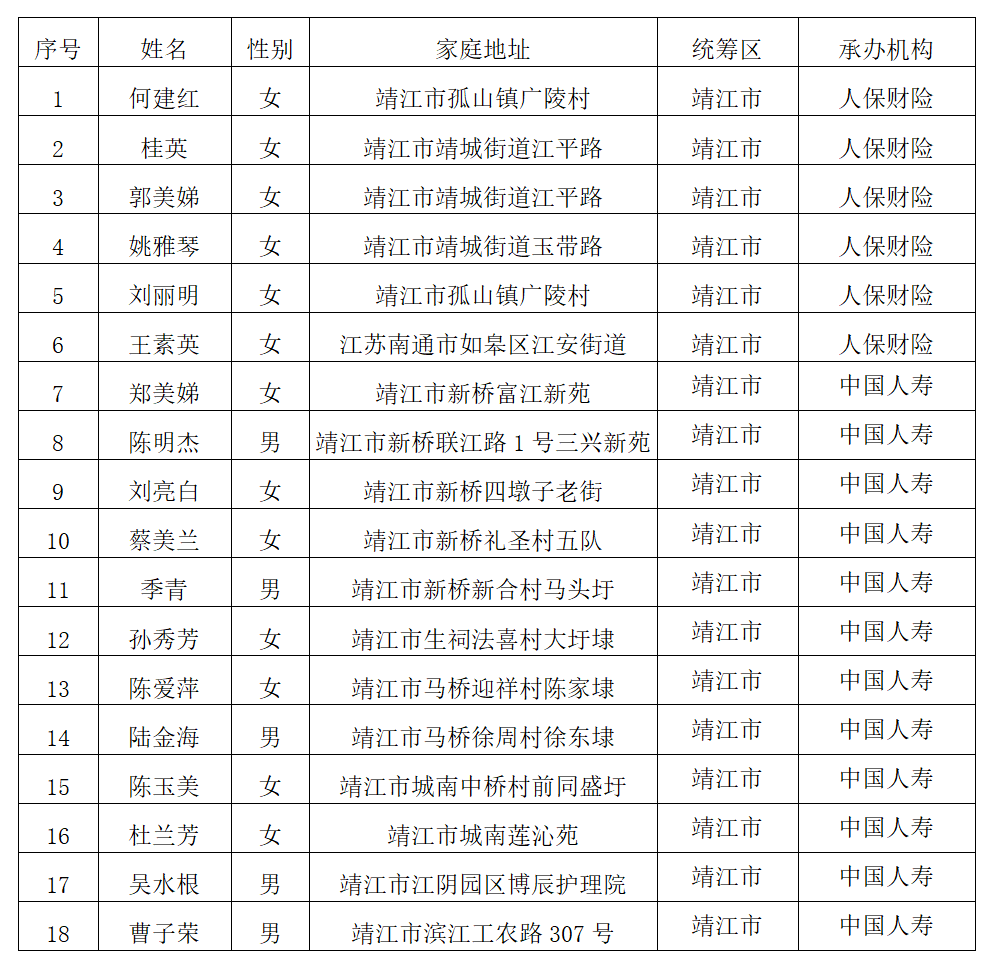 靖江市长期护理保险重度失能人员公示名单
