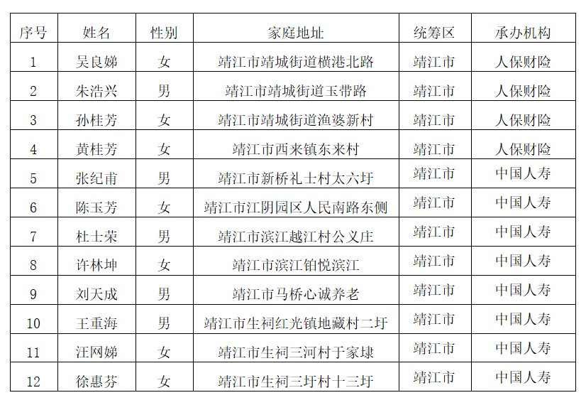 靖江市长期护理保险重度失能人员公示名单