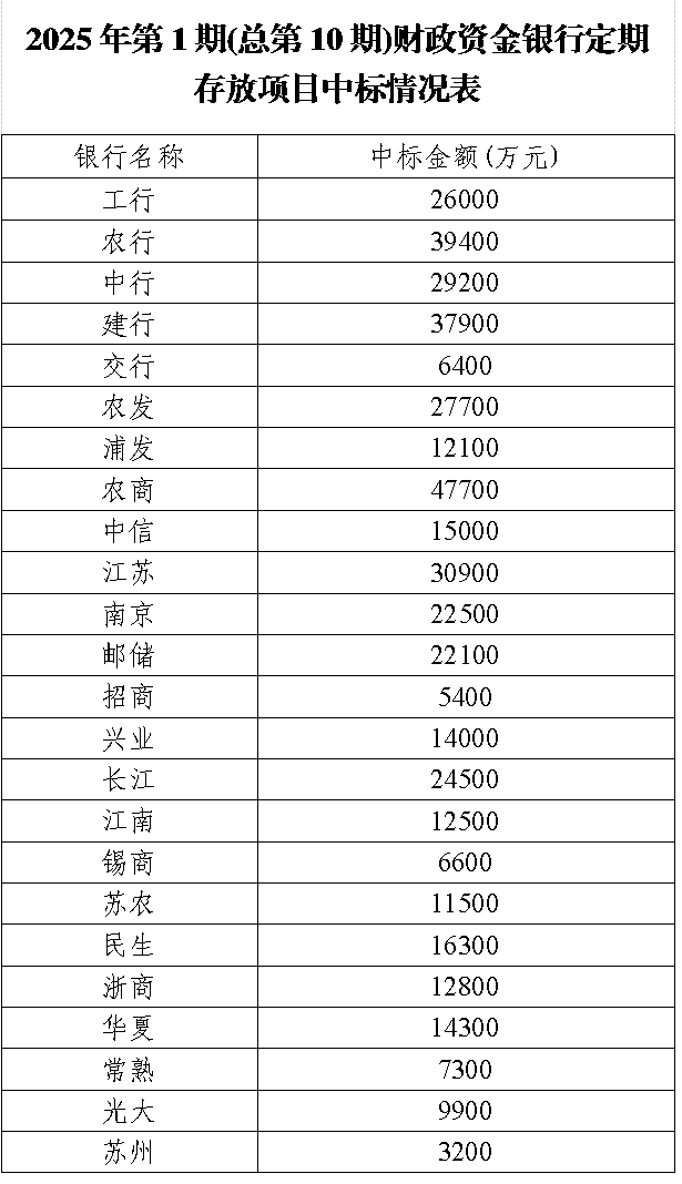 靖江市财政局于2025年12月16日举办了市本级财政资金银行定期存放项目(2025年第1期,总第10期)招标活动,现将招标结果公告如下。