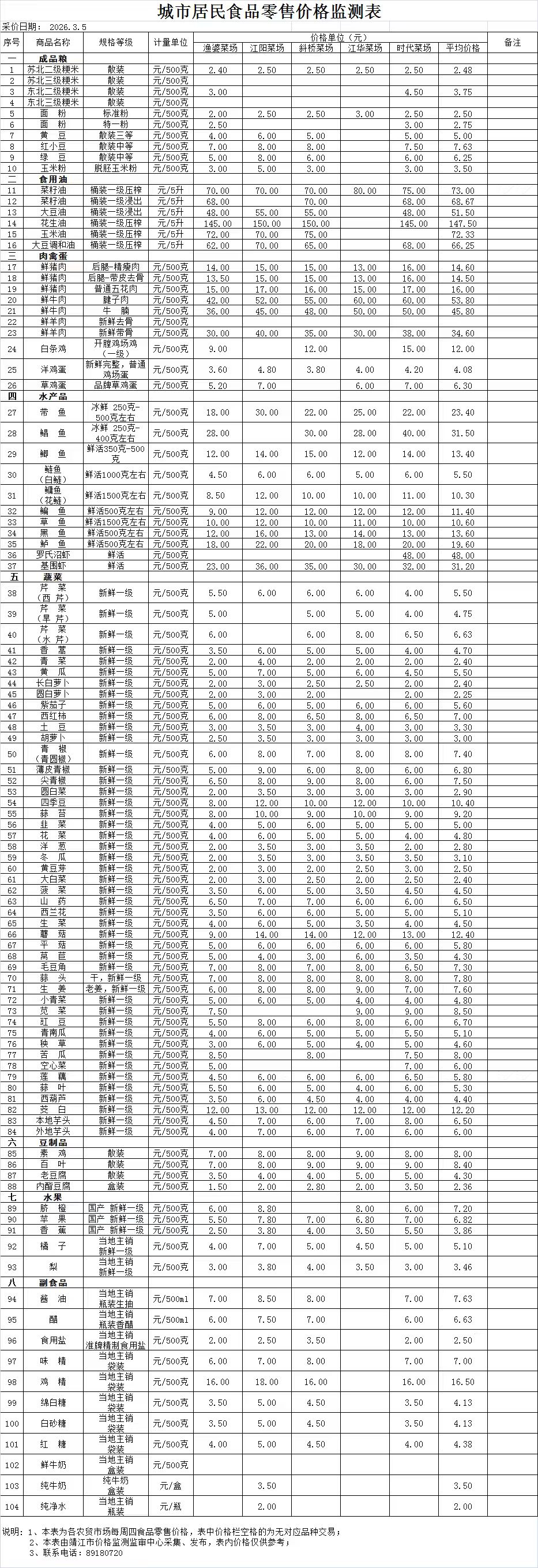 城市居民食品零售价格监测表(农贸市场)