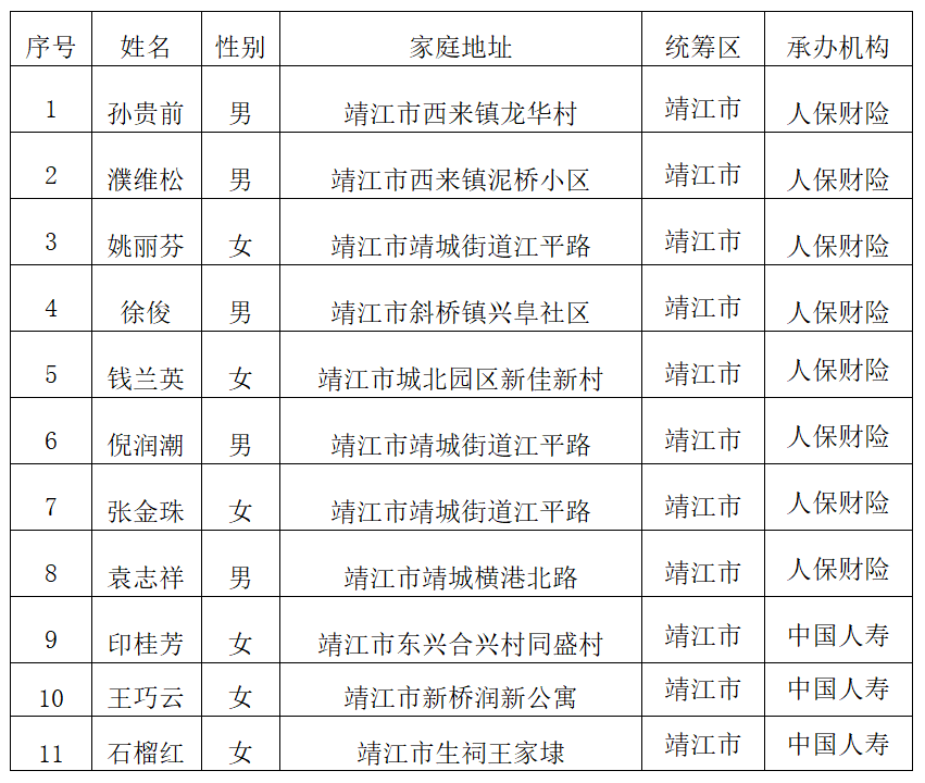 靖江市长期护理保险重度失能人员公示名单