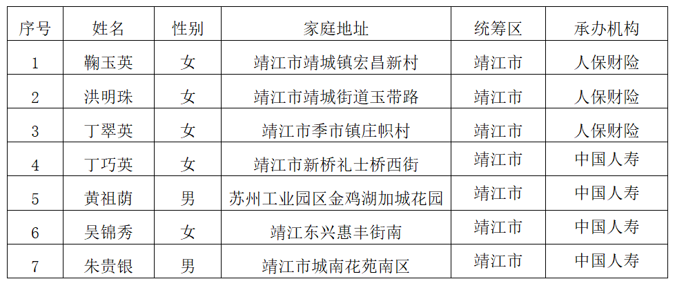 靖江市长期护理保险重度失能人员公示名单