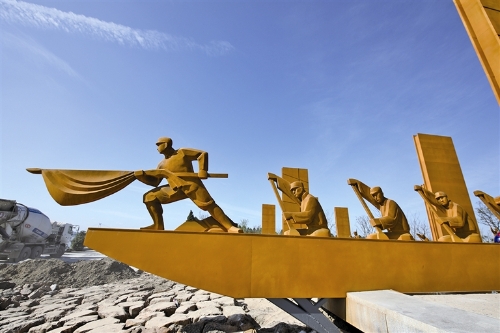 船帆临江而立、军民奋力划桨……经过周密安排、精心施工,“东线第一帆”纪念公园以崭新的形象亮相江边。
