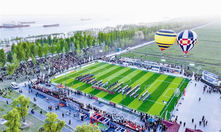 一边是激情澎湃的绿茵赛场,一边是岁月静好的江畔风光。不少观众漫步在新合村江畔彩虹桥,欣赏长江日落,邂逅芦苇湿地,打卡世界最高输电铁塔,尽享宝藏乡村的“诗与远方”。新桥镇作为揭幕战东道主,因地制宜打造“江畔村超夜市”,精心设置56个摊位,涵盖地标农副产品、风味美食小吃、亲子休闲游乐等多元品类,以浓郁烟火气赋能赛事经济、撬动消费增量。