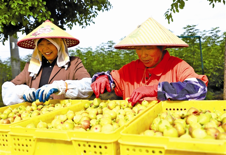 近日,季市镇康养生态园无花果基地里,近500亩甘甜的无花果陆续进入成熟期,迎来了丰收季,亩产可达3000斤。图为果农们采摘、分拣无花果。马钰超摄