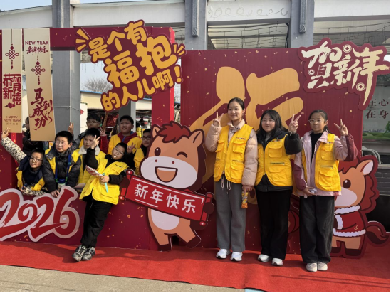 在孤山脚下的山前广场,精心布置的“福抱”美陈成为游客喜爱的“新春打卡点”。红金配色的背景板上,“是个有福抱的人儿啊”的趣味标语传递着新春祝福,“2026”“新年快乐”的字样与生肖马卡通形象相映成趣,将传统年味与现代审美巧妙融合。为迎接春节的到来,孤山镇(城北园区)在辖区主要干道挂满中国结和灯笼,在公园景点、集中居住区等重要点位布置具有浓厚节日氛围的新年美陈、踩“福”大道等特色公益小品,让新春的仪式感在孤山城北持续升温。